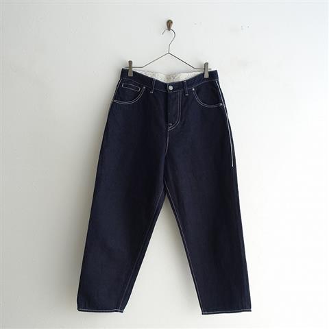 デザイン:mina perhonenのalways ロールアップデニムパンツです。カラーはインディゴネイビーで、ノンストレッチのデニム地で仕立てられています。開口部はボタンフライ仕様で、裾はロールアップデザインです。5ポケット付きで、ウエスト内側やポケット内袋にmermaidテキスタイルの刺繍があしらわれています。定価は31000円+税の商品です。