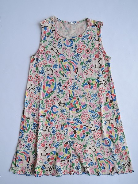 デザイン:mina perhonen 「paradis」のノースリワンピースで、子供用アイテムです。カラーはベージュ、青、緑、ピンク、ブラウンなどで、少し透け感のある天竺ニットです。両肩のスナップボタン開きで、ポケットはございません。裾のヘムはウェーブが施されたロックミシン始末です。 (掲載写真は、実商品のカラーにできるだけ近づけるよう努力はしておりますが、お使いのモニターや画面設定等によっては、色が異なって見える場合もございますので、予めご了承下さい)