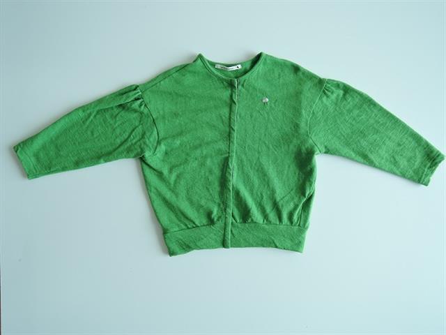 デザイン:mina perhonenのcozy アンゴラカーディガンです。カラーはグリーンで、柔らかなニット地で仕立てられています。スナップボタン開きで、左胸に蝶々のワンポイント刺繍入りです。
