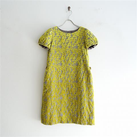 デザイン:mina perhonenのchorus リネン刺繍ドレスワンピースです。カラーはグレー×イエローで、パイルジャガードの刺繍が全面にあしらわれております。袖口はゴム入りで、バックファスナー半開で着脱でき、共布のひもベルトが付いております。両腰にシームポケット付き、裏地付きです。