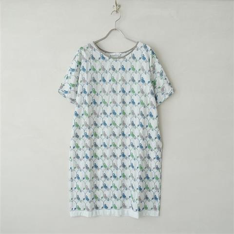 デザイン:mina perhonen「mela」のエンブロイダリーワンピースです。カラーは淡いグリーンベース×黄緑・灰色・薄紺の刺繍です。素材はコットンの、透け感がある薄手パンチング生地です。プルオーバーデザインで、ポケットはございません。定価は61,840円(税込)の商品です。