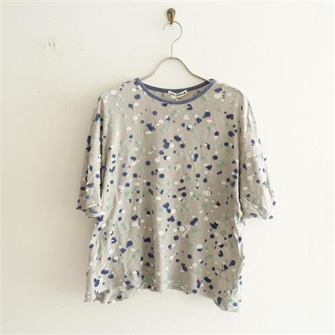 デザイン:mina perhonenのnebula カットソーです。カラーはグレーで、やや透け感のあるガーゼ調の薄手地ベースに、ドットのようなパイル柄が施されたデザインです。衿ぐりにはパイピングが施され、プルオーバータイプの着脱です。本体価格18.000円です。