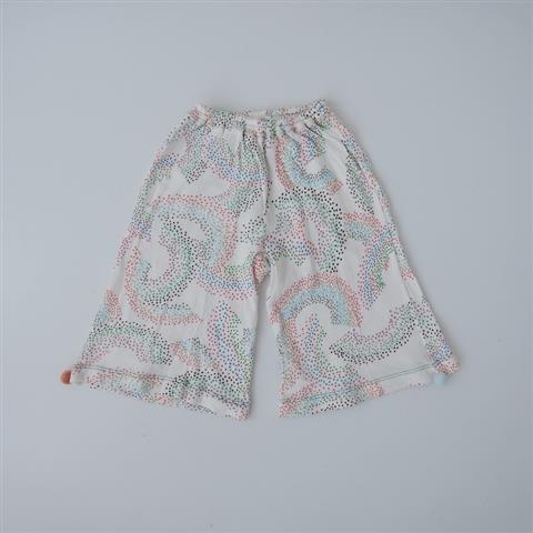 デザイン:mina perhonenのrainbowパンツです。カラーはオフホワイトベースにブルー・グリーン・ピンクなどカラフルなドット状の総柄プリントで、カットソー素材で仕立てられています。ウエストゴム入りで、両裾にポンポンがあしらわれたデザインです。子供用アイテムです。