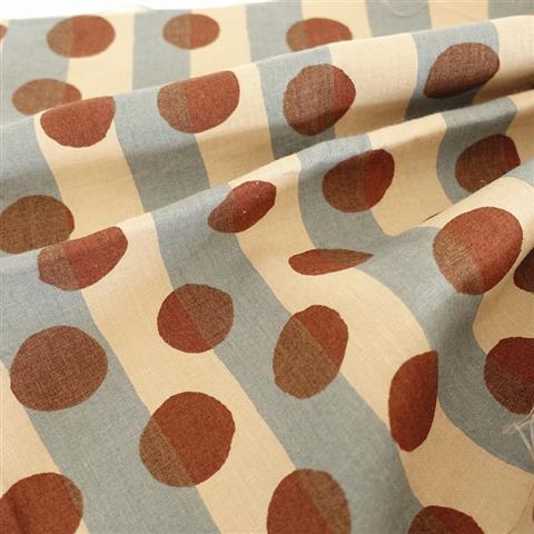 デザイン:mina perhonenのfriend プリント生地です。カラーはベージュ系とダークグレーのストライプ(ボーダー)柄ベースに、ダークブラウンのドット柄がプリントされているテキスタイルとなっております。