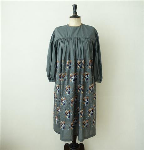 デザイン:2019年春夏コレクション mina perhonen「sand rose」コットンシルクエンブロイダリードレスです。カラーはモスグリーンベース×ベージュ・キャメル・水色・紫の刺繍です。コットンとシルクの光沢がある、薄手の生地です。背上部の3ボタン・ループと、袖口1ボタン開きのプルオーバーワンピースです。バスト周りと袖山、袖口にギャザーがあしらわれ、両サイドにシームポケットがございます。本体価格は76,000円+税の商品です。