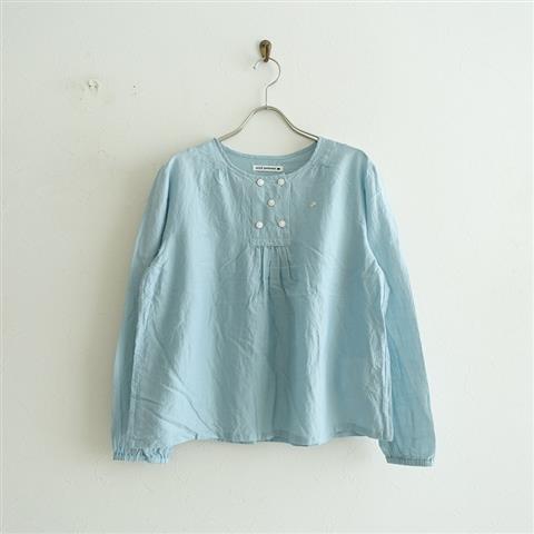 デザイン:mina perhonenのTurku コットンシルクブラウスです。カラーはライトブルーで、微起毛がかったコットンシルクの生地で仕立てられています。5つボタン付きのプルオーバータイプの着脱で、袖口はゴム仕様、左胸に蝶々のワンポイント刺繍入りです。