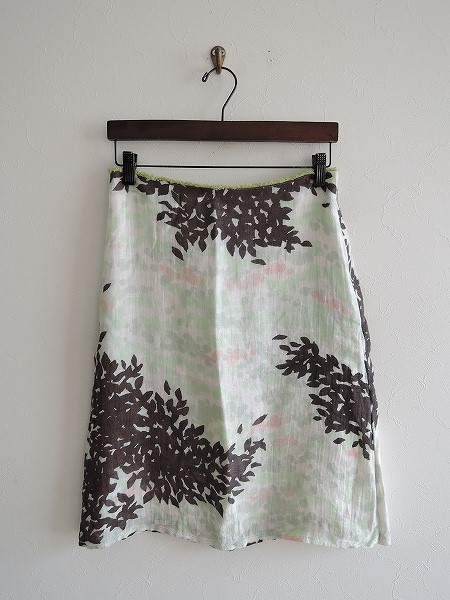 デザイン:mina perhonen 「water lily」のスカートです。カラーはオフホワイトベースに淡いグリーン・薄サーモンピンク・ブラウングレーなどの総柄で、左サイドジッパー、裏地付きです。 (掲載写真は、実商品のカラーにできるだけ近づけるよう努力はしておりますが、お使いのモニターや画面設定等によっては、色が異なって見える場合もございますので、予めご了承下さい)