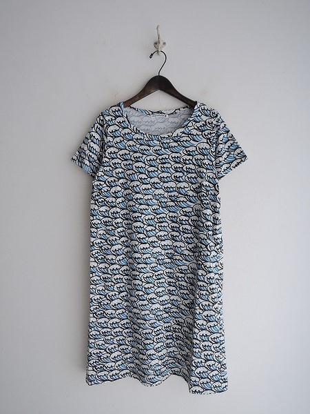 デザイン:mina perhonenのnami プリントカットソーワンピースです。カラーはホワイトベースにグレー・ブラック・ブルーのテキスタイルプリントで、天竺ニット地です。プルオーバータイプの着脱で、ポケットは付いておりません。