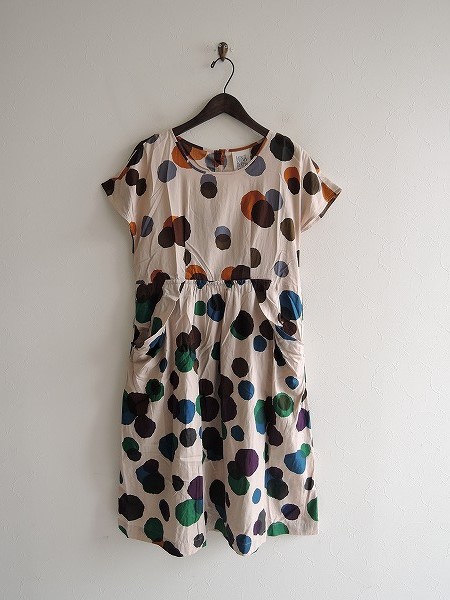デザイン:mina perhonen laundryのrain starドレスです。カラーはくすんだうすだいだい色ベースにブルー・グリーン・ブラウン・パープルなどのカラフルなランダムドット柄プリントで、薄手でやや透け感がございます。バックネックボタン開閉で、ウエスト切り替えが施されており、両腰辺りにポケットがございます。本体価格36,000円(税抜き)の商品です。