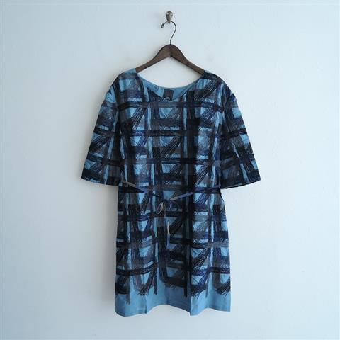 デザイン:mina perhonenのrefraction 刺繍ワンピースです。カラーはブルーベースに、ネイビー、ダークグレー、ブラックなどの刺繍が施された薄手生地で仕立てられています。プルオーバータイプの着脱で、ベルトループにレースひもが通っております。