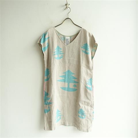 デザイン:mina perhonen laundry「mori no umi」のリネンプリントドレスです。カラーはナチュラルベージュ×ライトブルーで、柔らかなドンゴロス風の麻生地に、プリントがあしらわれております。プルオーバータイプのサックドレスです。両サイドにシームポケットの袋布はピンクの別布で、チラッと見えます。裏地はございません。
