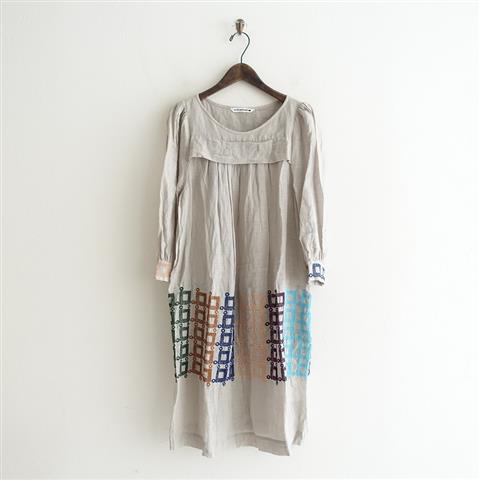 デザイン:mina perhonen「flower table」のリネンガーゼエンブロイダリードレスです。カラーはライトグレー地×紺・茶・紫・水色などで、透け感があり、柔らかな薄手の麻ガーゼ生地に、刺繍があしらわれております。プルオーバータイプで、ネックラインは比翼仕立て、袖山と袖口はギャザーが施され、カフスはボタン・ループ留めです。裏地・ポケットはございません。本体価格は60,000円+税の商品です。
