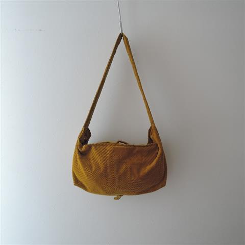 カラーはマスタードで、ジャガードコーディロイの柄の数々をパズルの様にコラージュして、空から見下ろす景色の様に組み合わせた「land puzzle」のテキスタイルです。表側に、chouchoのワンポイントが付いております。