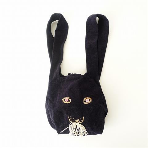 デザイン:mina perhonenのusa bag うさバッグ小です。カラーはネイビーで、ベロアのようなモールスキンで仕立てられています。ピンクのボタン・ベージュのステッチ・オフホワイトの紐でうさぎの顔がデザインされたお品で、持ち手は耳の様にあしらわれています。内側にポケットが1つ付いており、素材は綿63%,毛30%,ナイロン7%です。(掲載写真は、実商品のカラーにできるだけ近づけるよう努力はしておりますが、お使いのモニターや画面設定等によっては、色が異なって見える場合もございますので、予めご了承下さい)