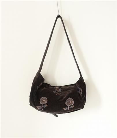 デザイン:mina perhonenのchumショルダーバッグ小です。カラーはチャコールグレーのベルベット生地に、パープルグレー・グレーブルー・キャメルで刺繍が施されたデザインで、ドットの刺繍で構成された花々が浮遊するように描かれ、仲良く首をかしげるように並んでいるテキスタイルです。開口部はジッパーで、内側はブラウンの裏地&ジッパーポケットが1つ付いています。ショルダーストラップ以外にも手から提げることのできる持ち手の付いた2way仕様で、素材は表地ベース・パイル・裏地が綿100%、刺繍部分が綿76%,レーヨン24%です。定価26,400円(税込み)の商品です。