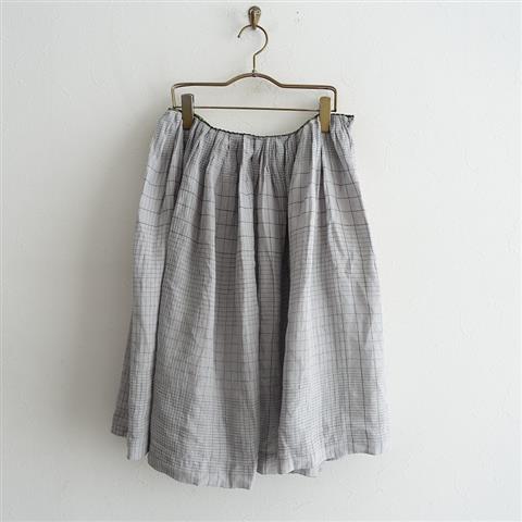 デザイン:mina perhonenのcahier リネンシルクチェック柄スカートです。カラーはライトグレー×ダークグリーンで、ランダムラインがあしらわれたやや透け感のある薄手素材です。左ウエストホック&ファスナー着脱式で、ウエストラインにグリーンのグログランテープとギャザータックが施されており、裏地付きです。