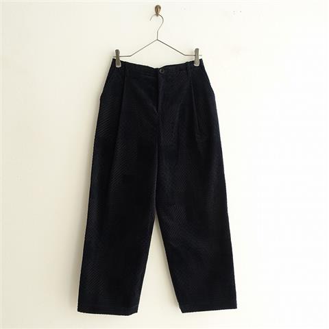 デザイン:mina perhonenのland puzzle コーデュロイパンツです。カラーは濃いネイビーで、ジャカードコーデュロイで仕立てられています。ボタン&ジッパーで着脱でき、タックが施され、両腰&両ヒップにポケット付きです。