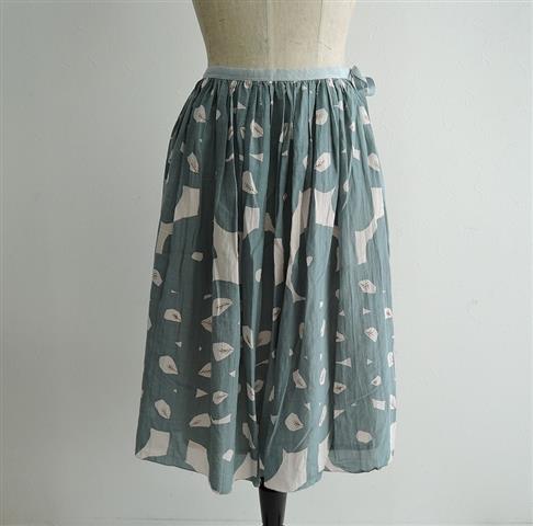 デザイン:mina perhonenのhana tricot ギャザーロングスカートです。カラーはくすみブルー系で、さらっとしたコットンシルクの薄手生地で仕立てられています。左腰フック&ファスナーで着脱でき、サイドにリボンが施されたデザインです。裏地付きです。(掲載写真は、実商品のカラーにできるだけ近づけるよう努力はしておりますが、お使いのモニターや画面設定等によっては、色が異なって見える場合もございますので、予めご了承下さい)