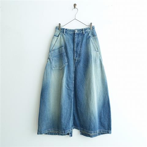 デザイン:mina perhonenのalwaysデニムスカートです。カラーはユーズド加工されたライトインディゴブルーで、フロントジッパーフライです。5ポケット+右フロントにポケットがあり、バックに37.5cmほどのスリットが入っています。ウエスト周りやポケットの内側にmermaidの刺繍柄が配されており、本体価格44,000円(税抜き)の商品です。