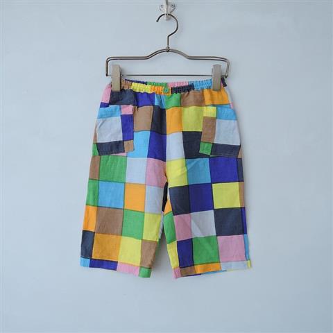 デザイン:mina perhonenのjelly リネンパンツです。カラーはピンク、イエロー、グリーン、ブルーなど色とりどりのカラーのチェックで、リネン地で仕立てられています。ウエストはゴム仕様で、両サイドにポケット付きです。