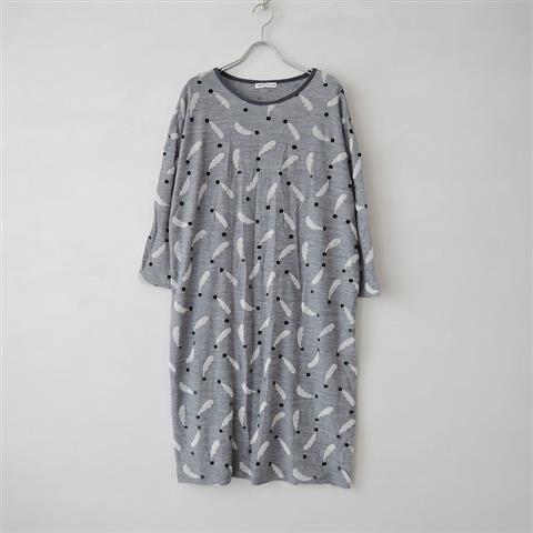 デザイン:mina perhonenのfeather seed ニットワンピースです。カラーはグレーベースに、アイボリーや光沢感のあるグリーン系のカットジャガード織で、柔らかな薄手ニット地であしらわれております。枝から離れた種が意志があるかのように自ら遠くへ飛んでゆく様子から着想を得て生まれたテキスタイルです。