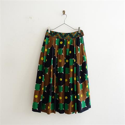 デザイン:mina perhonen「forest ring」のプリントウールタックスカートです。カラーはブラウン・グリーン・ブラック・白・レノンイエローです。素材はウール100%の、細かなシボがあるやや薄手の生地です。左のジッパー&2ボタン開きで、ウエスト部分はパイピング仕立て、ギャザーとタックがあしらわれております。ポケットはなく、裏地付きです。本体価格は58,000円+税の商品です。