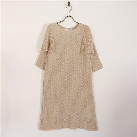 デザイン:mina perhonenのstardust ニットワンピースです。カラーはベージュで、インが見える柄編みのニットで仕立てられています。プルオーバータイプの着脱で、2種類の異なる柄を袖や裾部分で繊細に組み合わせたデザインです。定価は68200円の商品です。