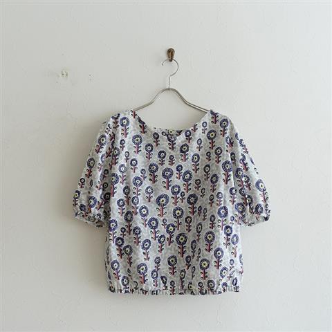 デザイン:mina perhonen「famille」のプリントコットンブラウジングシャツです。カラーはライトグレーベース×紺・紫・ピンク・深緑です。うっすら透け感がある薄手の布帛です。背上部の4つボタン開きで、広く開いたVネックラインです。袖口はギャザーが施されており、裾はゴム入りです。本体価格は28,000円+税の商品です。