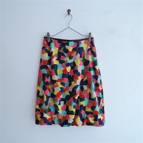 デザイン:mina perhonenのpiazza ベルベットバルーンスカートです。カラーはグリーン・レッド・ピンク・イエロー・ライトグレー・ベージュ等で、カラフルなプリントのベルベット地で仕立てられております。フロントにタック入りで、ウエストはパープルのベルベットのパイピングが施されており、左腰ファスナー開閉で着脱できます。裏地付き、裾はゴム入りのバルーンシルエットになっております。