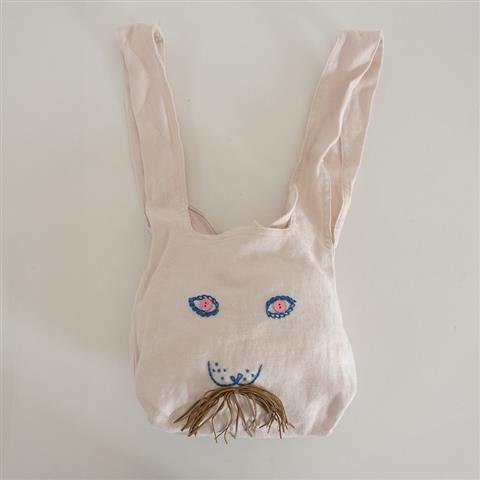 カラーはくすみのある薄ピンクで、ピンクのボタン・ブルー系のステッチ・ブラウンベージュの紐でうさぎの顔がデザインされたお品で、持ち手は耳の様にあしらわれています。内側にオープンポケットが1つ付いており、素材はあさ85%・綿15%です。