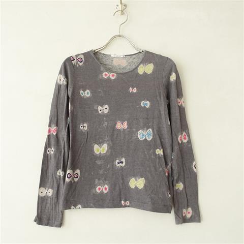 デザイン:mina perhonenのhana hane コットンプリントカットソーです。カラーはムラ感のあるダークグレーベースに、ライトグレー・ピンク・パープル・ライム・ターコイズ等カラフルなチョウチョのプリントの薄手ニット地で仕立てられております。