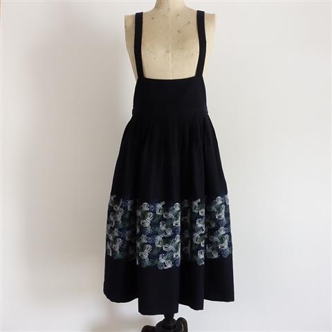 デザイン:mina perhonenのribbon breeze ジャンパースカートです。カラーはダークネイビーで、微起毛地で仕立てられており、ネイビー・グリーン・サックス・ブルーグレーで刺繍があしらわれております。肩紐は二段階で長さ調整可能になっており、ウエスト周りはプリーツ入りで、左腰ファスナー開閉で着脱できます。右腰にシームポケットが付いており、裏地付きです。定価68,200円(税込み)の商品です。