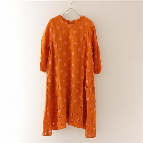 デザイン:mina perhonen laundryのvapor 刺繍リネンワンピースです。カラーはオレンジで、くったりとしたリネン地で仕立てられ、ドットの刺繍やカットワーク刺繍があしらわれています。背上部にループボタン付きのプルオーバータイプの着脱で、衿ぐりやカットオフ、袖口はゴム仕様になっております。両サイドにポケット付きです。