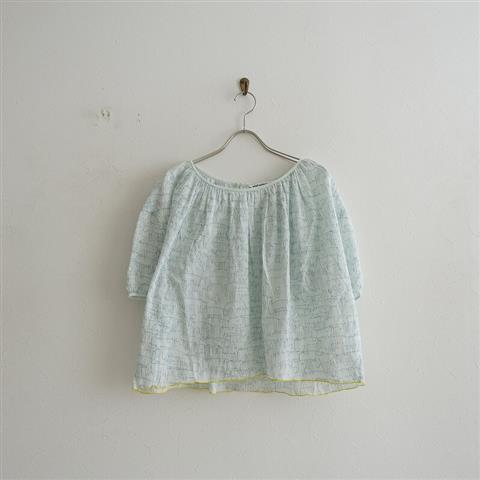 デザイン:mina perhonen「treasure」のプリントコットンオーバーブラウスです。カラーは薄いグリーンベース×青緑・レモンイエローです。格子の地模様が織り込まれた、薄手の透け感がある綿生地です。背上部のボタン・ループ開きのプルオーバーで、ネックラインと袖口にはギャザーが施されております。裾はロックミシンのメロー始末です。フロントに、スワロフスキーが光る花が一つございます。