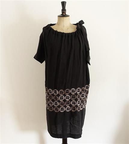 デザイン:mina perhonenのdear リネンスモックワンピースです。カラーはブラックで、リネン特有の張りのある生地で仕立てられており、ライトグレー・グレーで刺繍があしらわれております。ネック部は共布ひも入りで、プルオーバータイプです。