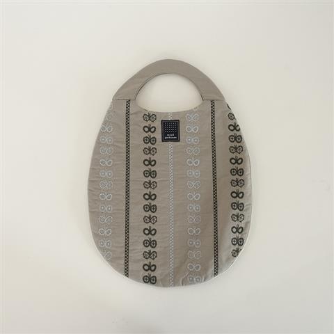 デザイン:mina perhonenのchiyo エッグバッグです。カラーはグレーベース(表記はグレー)にライトグレー・ダークグレーの刺繍があしらわれ、開口部はオープンです。裏地付きで、ポケットは付いておりません。表生地が綿100%、刺繍部分が綿100%、裏生地がポリエステル100%です。