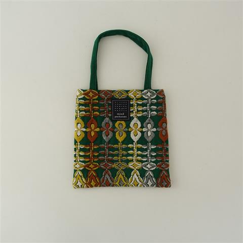 デザイン:mina perhonenのpetal flame ミニバッグです。カラーはグリーンベース(表記はグリーン)にブラウン・グレー・ホワイトなどのテキスタイル刺繍があしらわれ、開口部はオープン開きです。裏地付きで、素材は表生地が毛99%・ポリウレタン1%、刺繍部分がアクリル60%・毛40%、裏生地がポリエステル100%です。