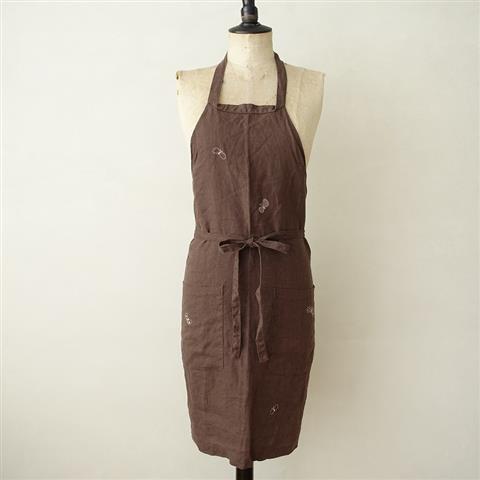 デザイン:mina perhonenのchouchoエプロンです。カラーはブラウンベースにベージュのちょうちょの刺繍があしらわれ、首紐、腰紐は共布で仕立てられています。フロント両腰辺りにポケットがあり、素材は麻100%、刺繍部分はキュプラ100%です。