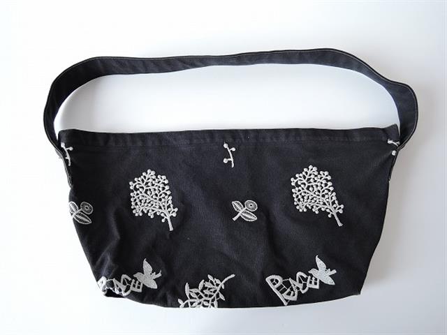 デザイン:mina perhonenのforest parade ボディバッグ小です。カラーはブラックで、キャンバス地で仕立てられ、グレーのテキスタイル刺繍が施されたデザインです。開口部はファスナー開きで、内側にはダークグレーの裏地とファスナーポケット付きです。表地、刺繍、裏地共に綿100%です。