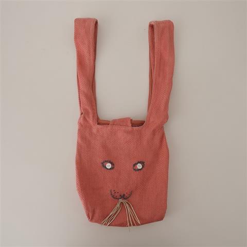 デザイン:mina perhonenのusa bagうさバッグ トートバッグです。カラーはピンクで、凹凸感のある生地で仕立てられており、開口部はひも結びです。ホワイトのシェルボタン、グレーの刺繍、アイボリーのスエード調ひもでうさぎさんのお顔がデザインされたアイテムで、内側に1つオープンポケット付き、素材は麻100%です。