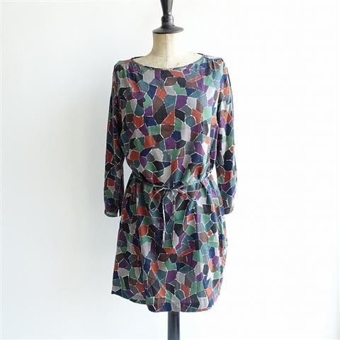 デザイン:mina perhonenのpiazza コットンプリントドレスワンピースです。カラーはグレー系・ネイビー・グリーン・パープル・ブラウン等で、総柄プリントの薄手生地で仕立てられております。袖口にはスリットが施されており、プルオーバータイプで、共布の腰ひもが付属されております。