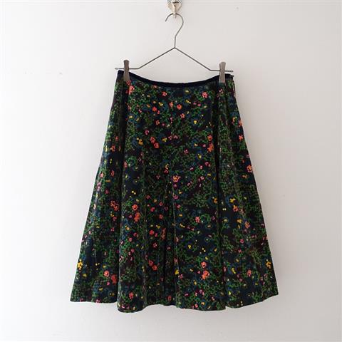 デザイン:mina perhonenのflower bed 別珍サーキュラースカートです。カラーはチャコールグレーベースに、グリーン系・ピンク・イエロー・レッドブラウン等の総柄の別珍生地で仕立てられており、裏地が付いております。フロント中央にボックスタック入りでフレアなシルエットになっており、ウエスト周りはネイビーのベロアテープが施され、左サイドのファスナー開閉で着脱できます。