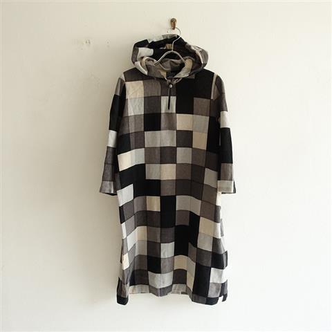 デザイン:mina perhonen「jelly」のカシミヤフードカラープルオーバーワンピースです。カラーは黒・グレー・ベージュなどです。カシミヤの起毛した糸で、ガーゼのようにフワッと平織された生地です。胸元のドロップホールはボタン&ループ留めです。裏地・ポケットはございません。