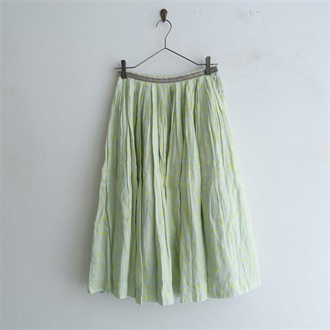 デザイン:mina「super ball」のリネンプリントプリーツスカートです。カラーはミルキーグリーン×レモンイエローです。麻の清涼感がある縦縞模様の生地です。左の長方形の貝ボタン開きで、ウエストにはパイル起毛のテープがあしらわれています。3つ折りの1タック仕様で、たっぷり生地を使ったフレアシルエットです。オーガンジーの裏地付き、左に内ポケット(ボタン開き)がございます。