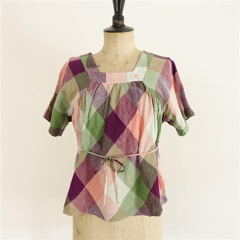 デザイン:mina perhonen laundry「hana kaze」のリネンチェックスモックブラウスです。カラーはピンク・紫・緑・水色などです。素材は、麻の糸節やネップ混のチェック織り生地です。スクエアネックには「choucho」の刺繍があしらわれ、トップラインに切替えギャザーが施されたプルオーバーブラウスです。サイドの共布の腰紐を結ぶデザインです。本体価格は27,000円+税の商品です。
