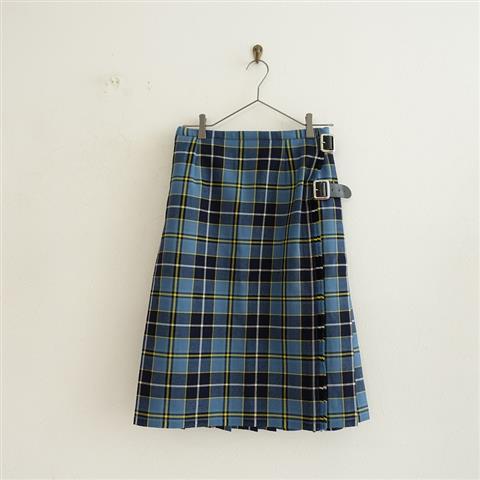 デザイン:mina perhonenのtartan チェックキルトスカートです。カラーはライトブルー×ネイビー×イエロー×ホワイトのタータンチェック柄で、LOCHCARRON社製のウール素材です。バックには手折りプリーツが施されており、ウエスト両サイドの牛革ベルトで着用するラップデザインで、サイズ調節可能です。バック腰に長めのベルトループ2つ付きで、腰周りに裏地付き、ポケットは付いておりません。