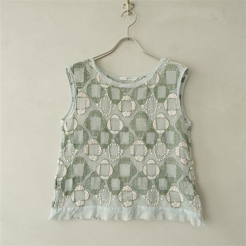 デザイン:mina perhonenのveronica コットン刺繍ノースリーブブラウスです。カラーはサックスベースのガーゼのような透け感のある薄手生地に、ホワイト・くすんだライトグリーンで刺繍があしらわれております。パイピングや裾はカットオフ仕様で、本体価格は33,000円(税抜き)です。