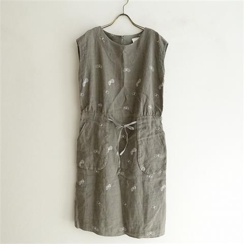 デザイン:mina perhonen laundryのchoucho リネン刺繍ドレスワンピースです。カラーはダークグレー系のミックスベースのリネン地に、ホワイトでチョウチョの刺繍があしらわれております。ウエストはひも&バックゴム入りで、バック襟元のボタン開閉のプルオーバータイプで、両サイドにポケット付きです。