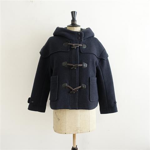 デザイン:mina perhonenのnordic moss ダッフルコートです。カラーはネイビーで、ふっくらとしたウォーム感のあるヤク&ウールツィード素材で仕立てられています。トグルボタン開きで、フード内側にはボア素材があしらわれ、フードにゴールドの蝶モチーフが付いております。両サイドにポケット付きで、定価は81000円の商品です。