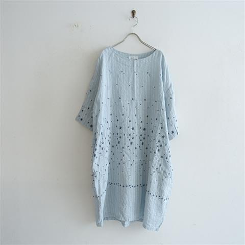 デザイン:mina perhonenのhoshi*hana 刺繍ワンピースです。カラーはライトブルーで、ストライプ織りのリネン地で仕立てられています。テキスタイル刺繍があしらわれ、ドロップショルダーのデザインです。両サイドにシームポケット付きです。